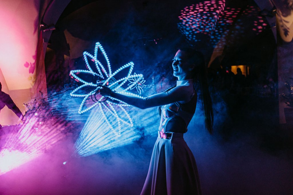 Unsere größte Hochzeitsshow, bei der wir Feuereffekte, SFX-Effekte, Projektionen und LED-Effekte kombiniert haben.