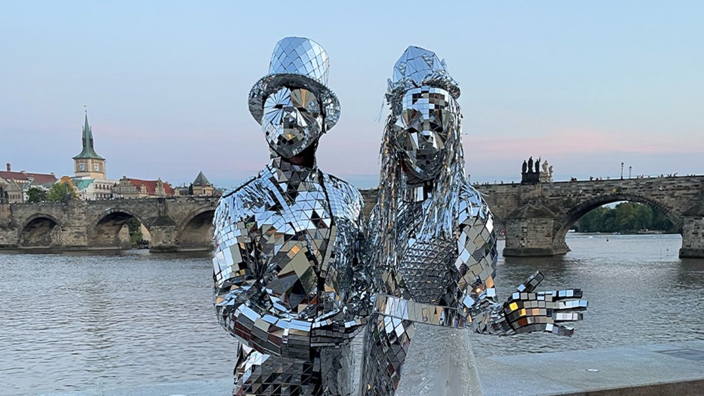Schauspieler in Spiegelkostümen lieben es zu reisen, und wir sind gespannt, wie viele Länder sie besuchen werden.
