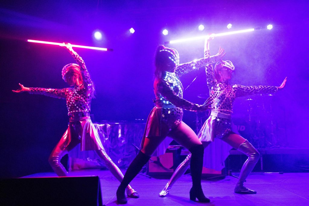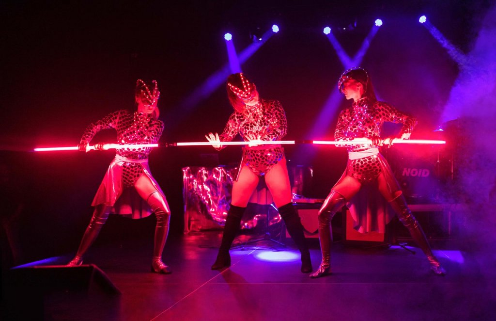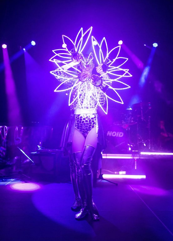 Der Höhepunkt der Veranstaltung war die Lichtshow. Für diese Aufführung haben wir die Kostüme der Darsteller mit Spiegeln dekoriert. Die gesamte Show wurde mit programmierbaren LED-Kostümelementen und Lasereffekten aufgewertet.