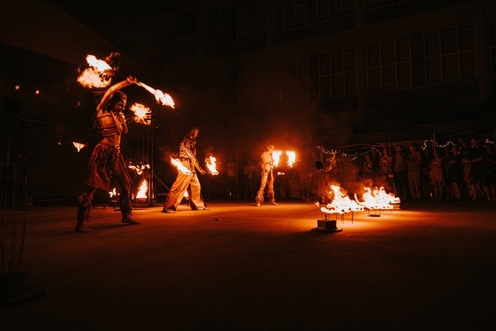 Das Ziel war es, eine Feuershow zu kreieren, die dem natürlichen Thema der Veranstaltung - Sommernachtstraum - entspricht. Die perfekte Veranstaltung für unsere "wilde" Tribal-Feuershow. Zusammen mit fantastischen Trommlern bereiteten wir eine 15-minütige Show mit Pyrotechnic Catherine Wheel, Bodenpyrotechnik, Feuerdekorationen und Flammenwerfern vor.