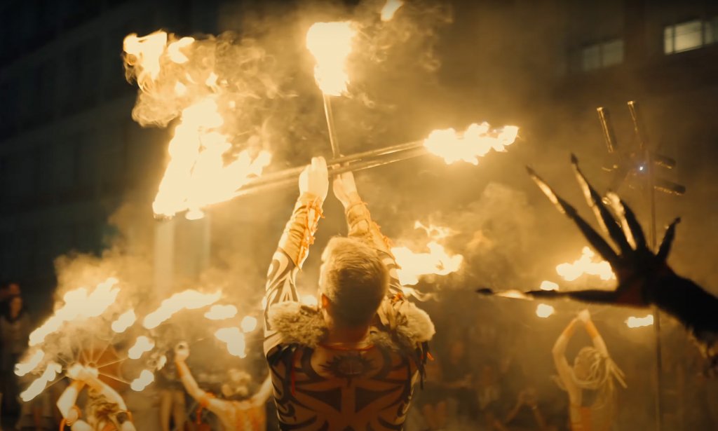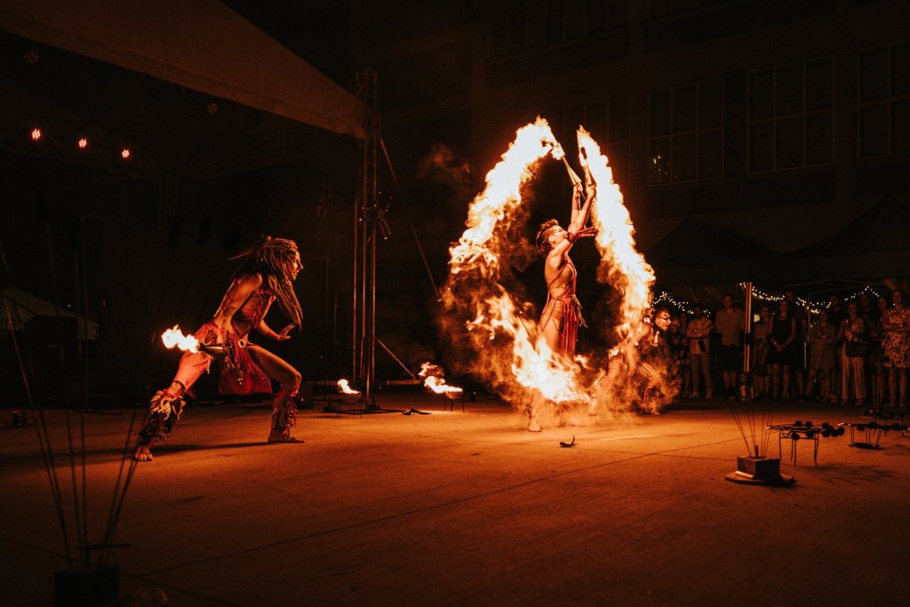 Eine der größten Feuershows, die je vorbereitet wurde. Fünf Feuerkünstler und sechs Trommler sorgen für eine wilde, energiegeladene Feuershow voller pyrotechnischer Effekte.
