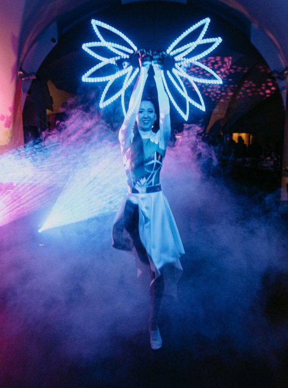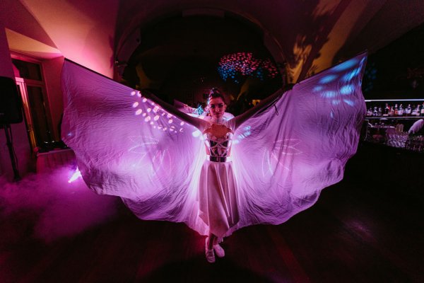 Eine Hochzeitsshow mit programmierbaren LED-Effekten, Projektionen auf die Kostüme der Darsteller und einer Anzeige der Namen des Brautpaares.