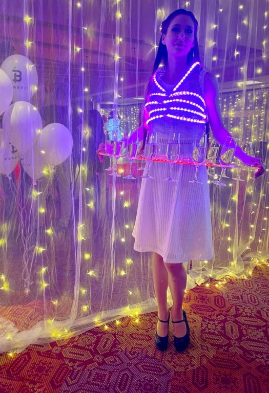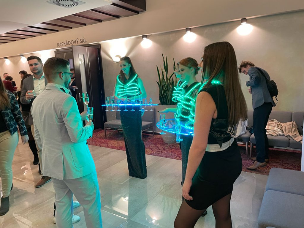 Wir lieferten LED-Hostessen in schwarzen und weißen Kleidern für Benefit und ihre unglaubliche Party, an der sogar der slowakische Rapper Rytmus teilnahm. Sie verteilten nicht nur die Begrüßungsgetränke von den beleuchteten Tischen aus, sondern sorgten auch für eine stimmungsvolle Atmosphäre und Unterhaltung der Gäste.